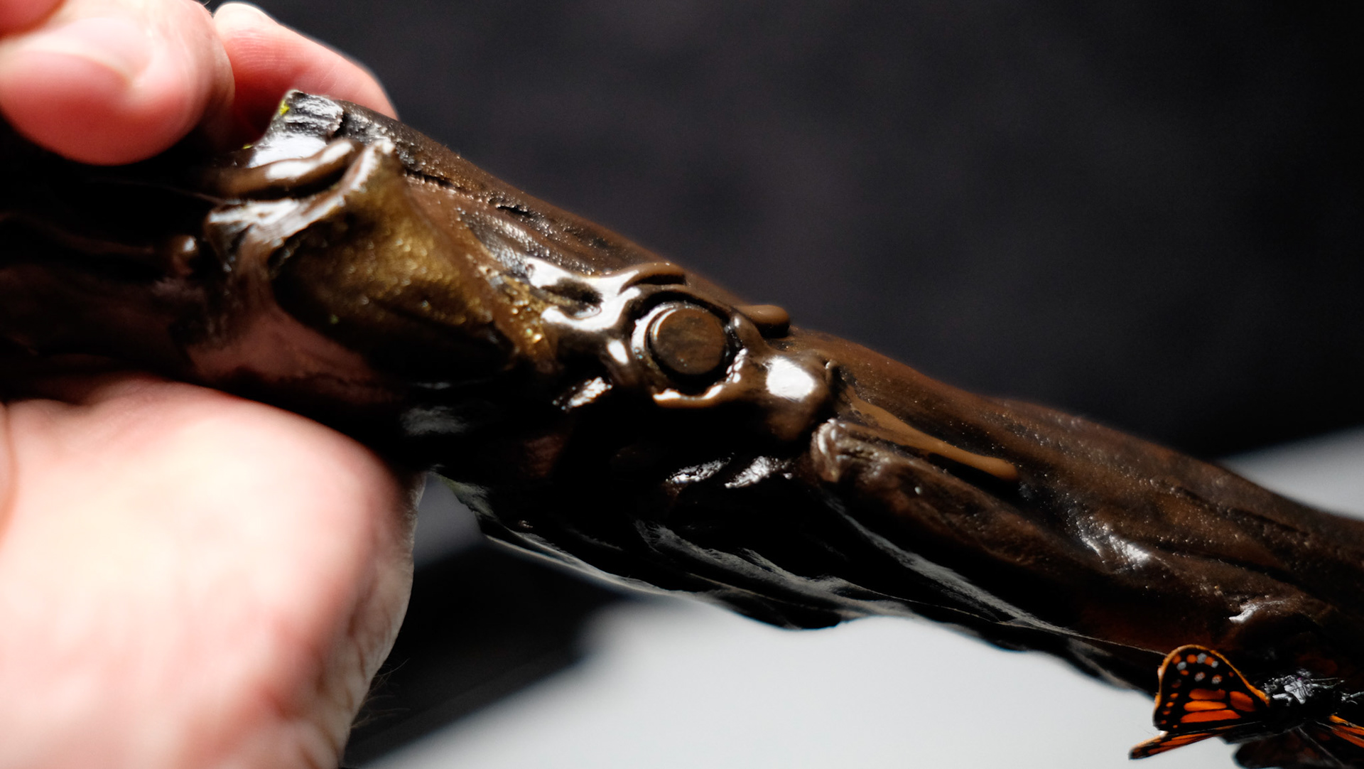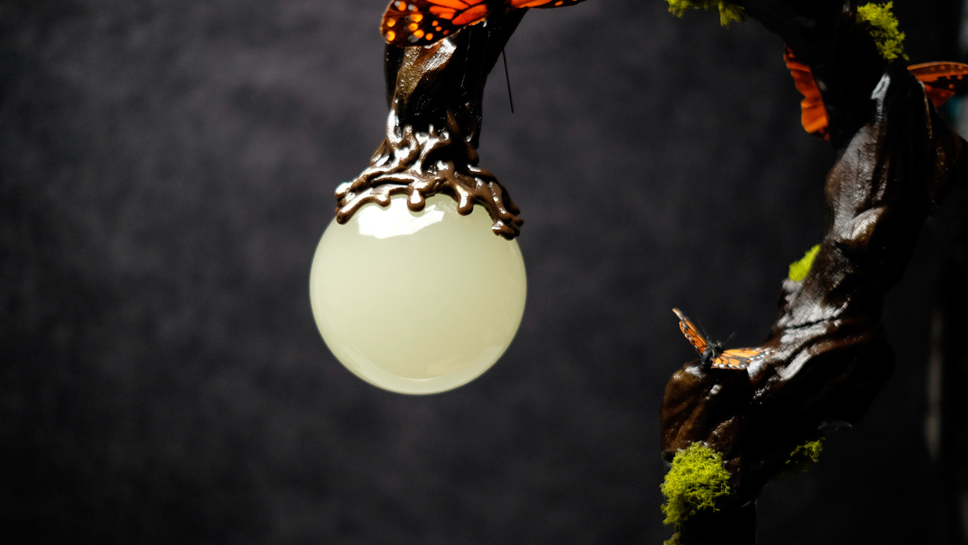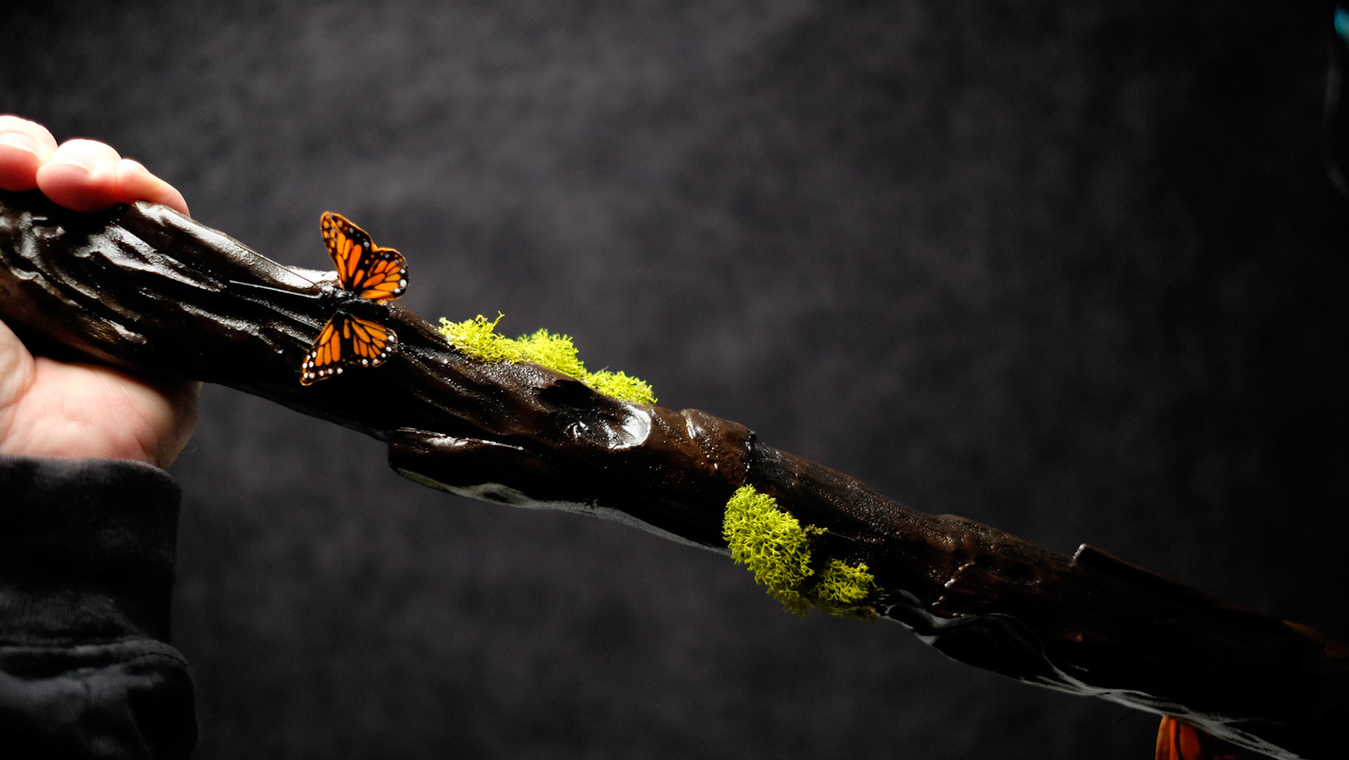 This Fae Staff design started with a commission from a Labyrinth Ball attendee who asked for a very specific style of staff to compliment her Fae costume. She wanted it to be a Fae-like staff with a hook and a glowing orb. I immediately loved the concept and started the design process. The core of this staff is made with PVC. The curve is made by using hot sand and boiling water. The outer shell is made with layers of EVA foam, sculpted using a dremel. The tip is equipped with a glow in the dark orb, which is illuminated with UV light, by pressing a button on the shaft. The option of a latching or a momentary push button are available upon ordering. The whole staff is completed with a shiny lacquer finish. The bottom of the staff is equipped with a rubber stopper to prevent it from sliding on the floor.