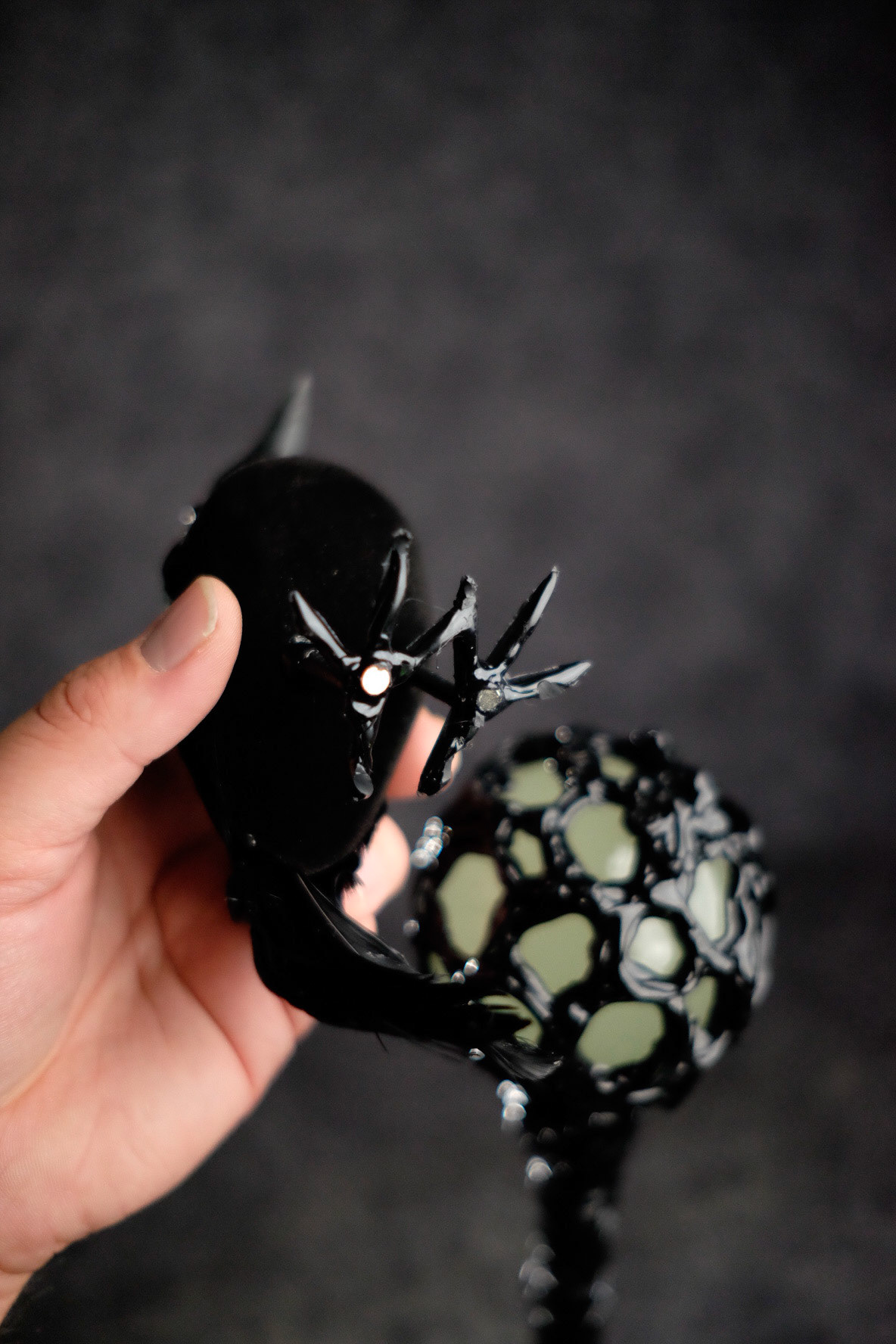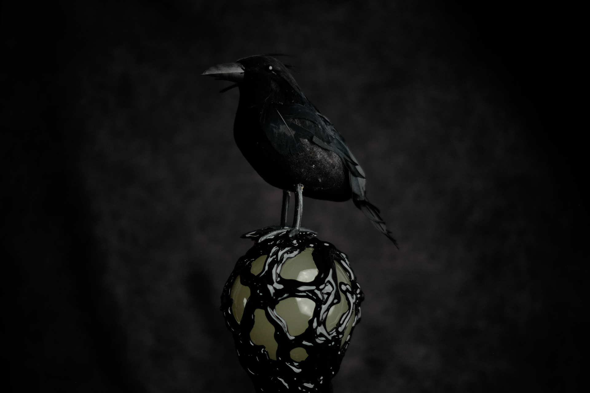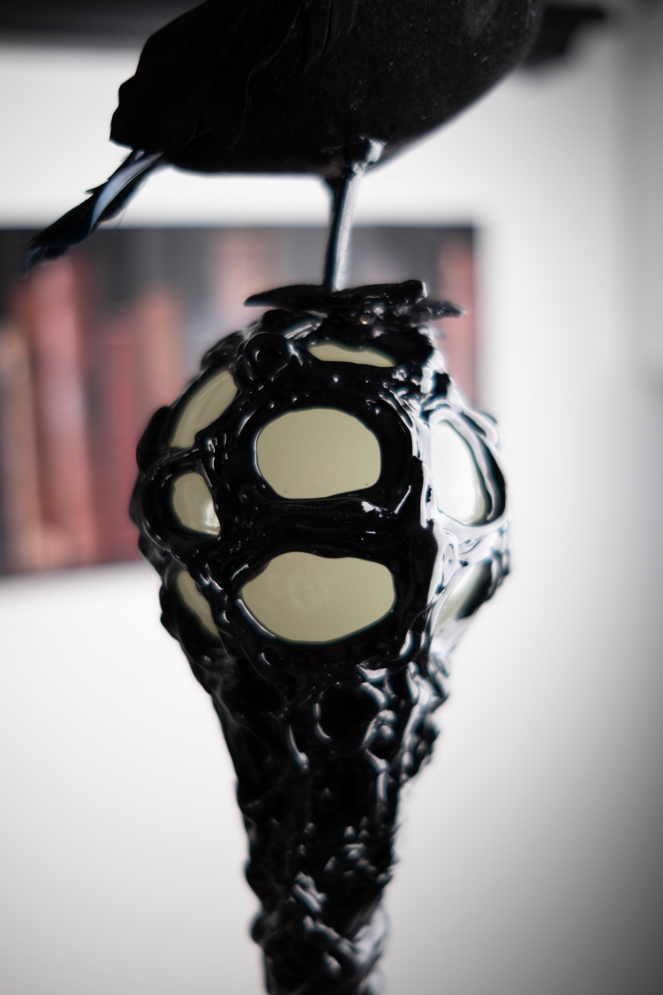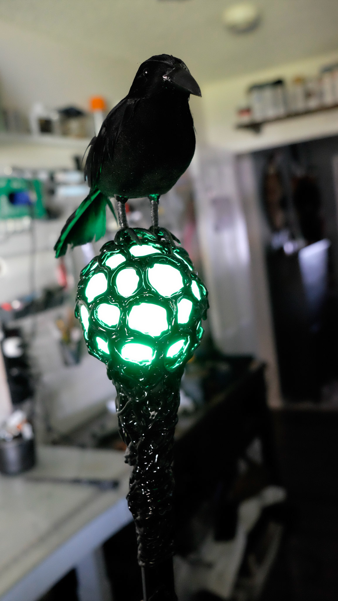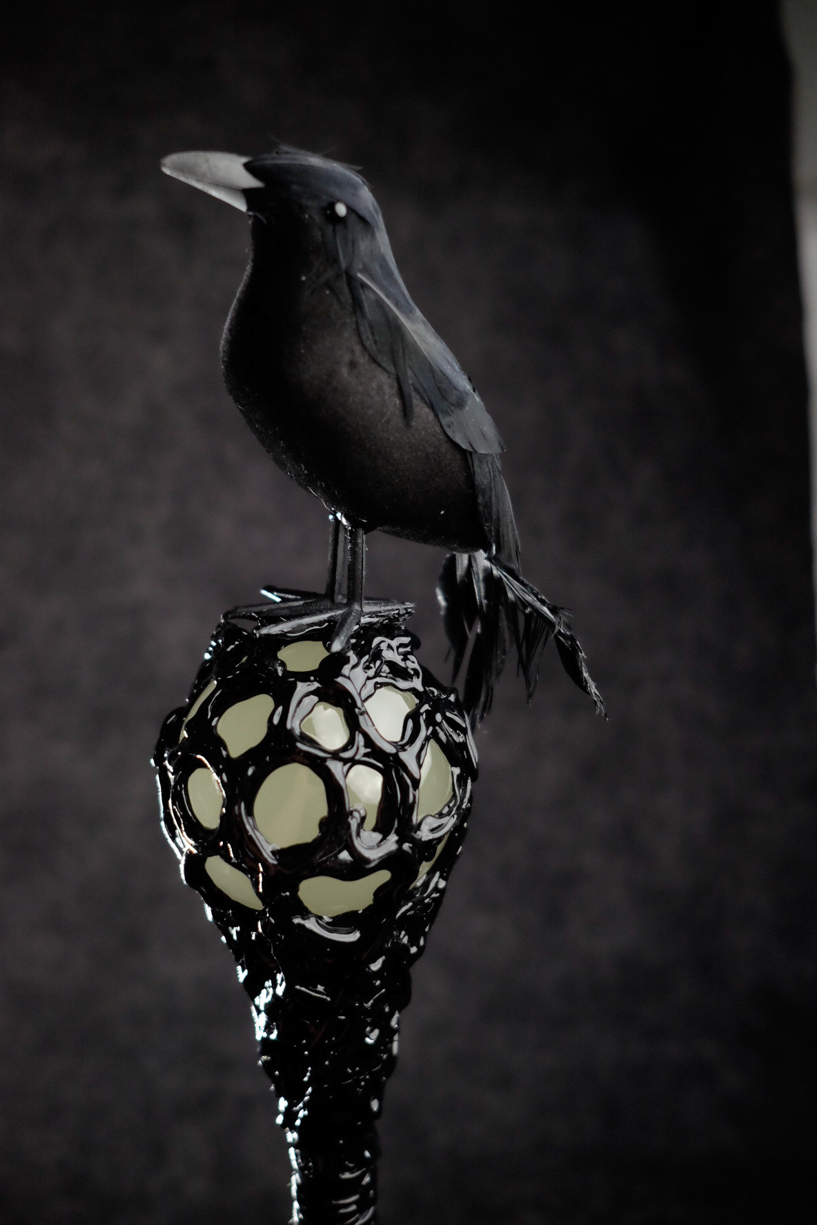 a raven with magnetic feet that can be placed on top of scepter. Scepter also has magnets incorporated into top. Magnets on scepter are disguised well so the scepter looks great with or without the raven on top.