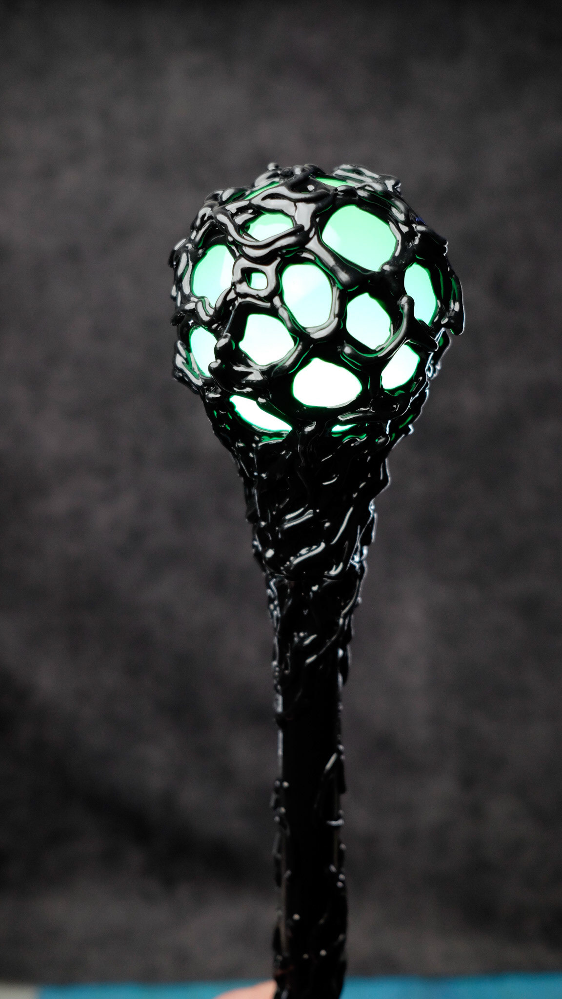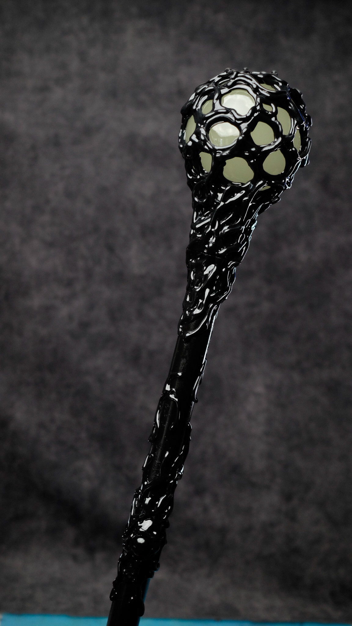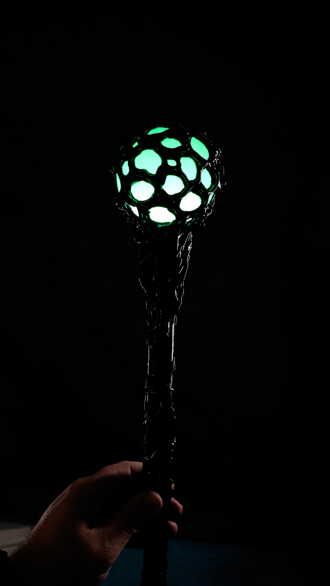 This scepter is gloss black and is equipped with a green glow in the dark orb. Aesthetically pleasing and toyetically engineered to perfection.