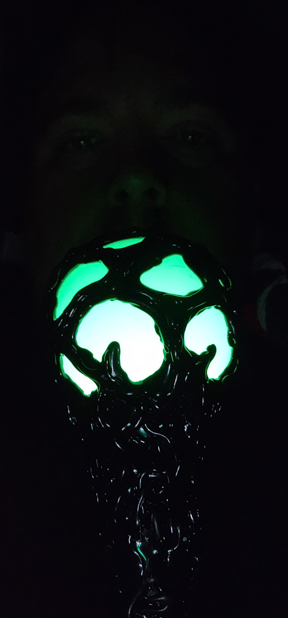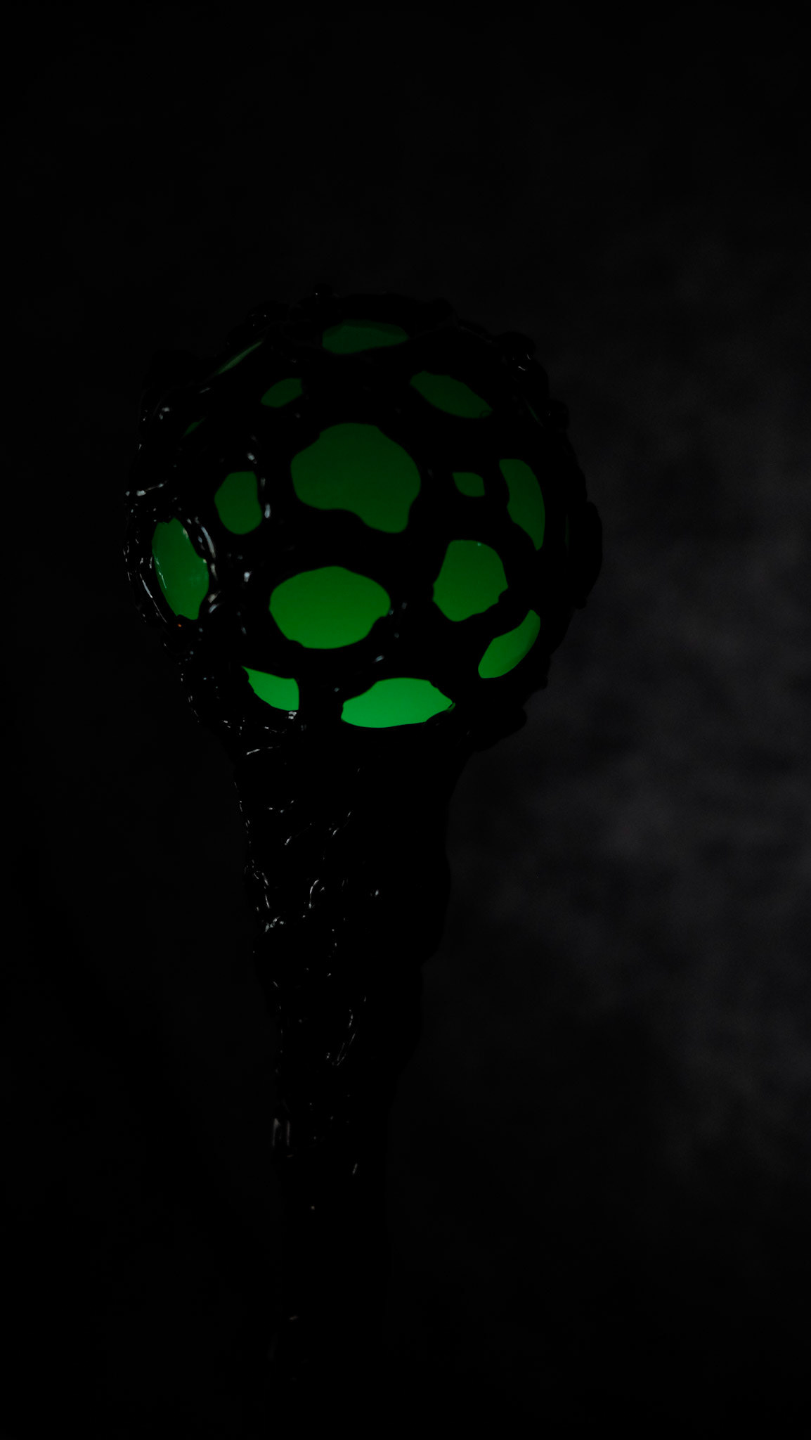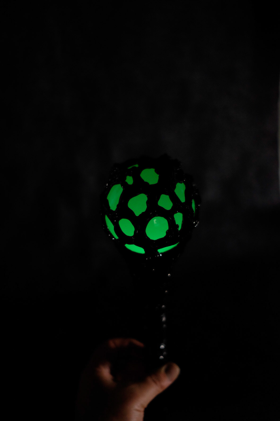 Includes the UV-LED + push button. While the button is pressed, the glow in the dark orb gets charged . After releasing the button the orb remains charged for a while with a lingering green afterglow. The battery chamber is easily accessible and disguised inside the neck. This upgrade requires 2 x AAA batteries.