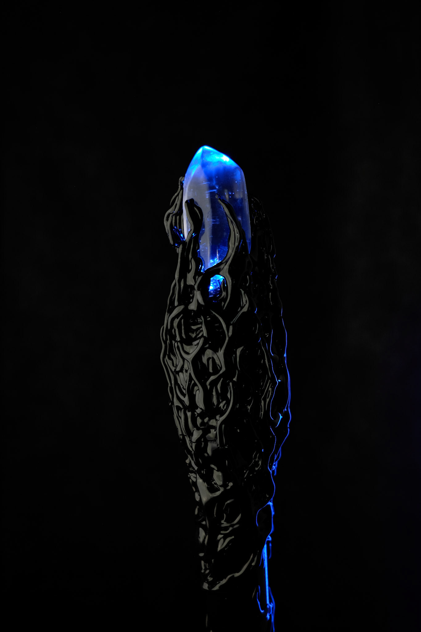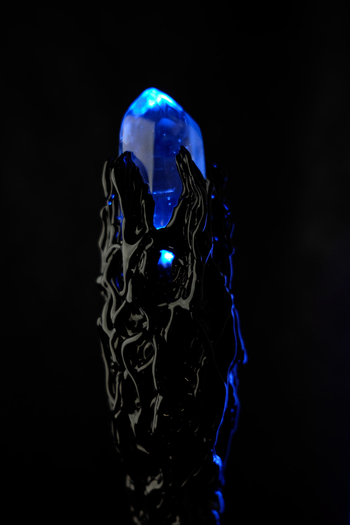 Each one of these staffs are made to order. The head has a crystal clear resin crystal with 3 flickering LED lights inside. These LED's are powered by a 9 volt battery which is hidden within the design and easily accessible directly inside the top of the staff. All electronics and wiring are bulletproof, as they are have been perfected over time. Everything gets soldered and insulated. Pick the option of a momentary push button (on only while pressed) or a latching push button (push on/push off).
