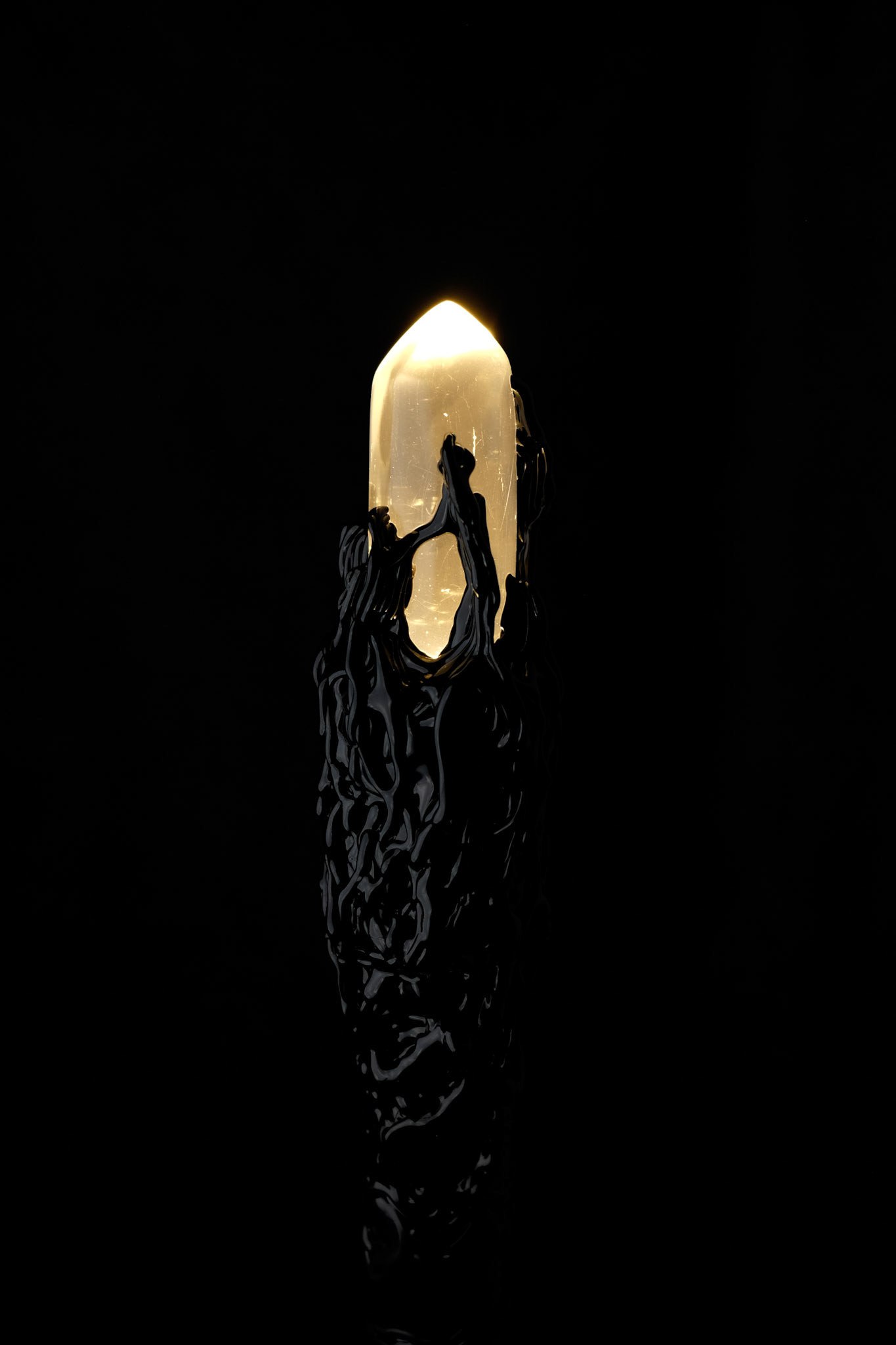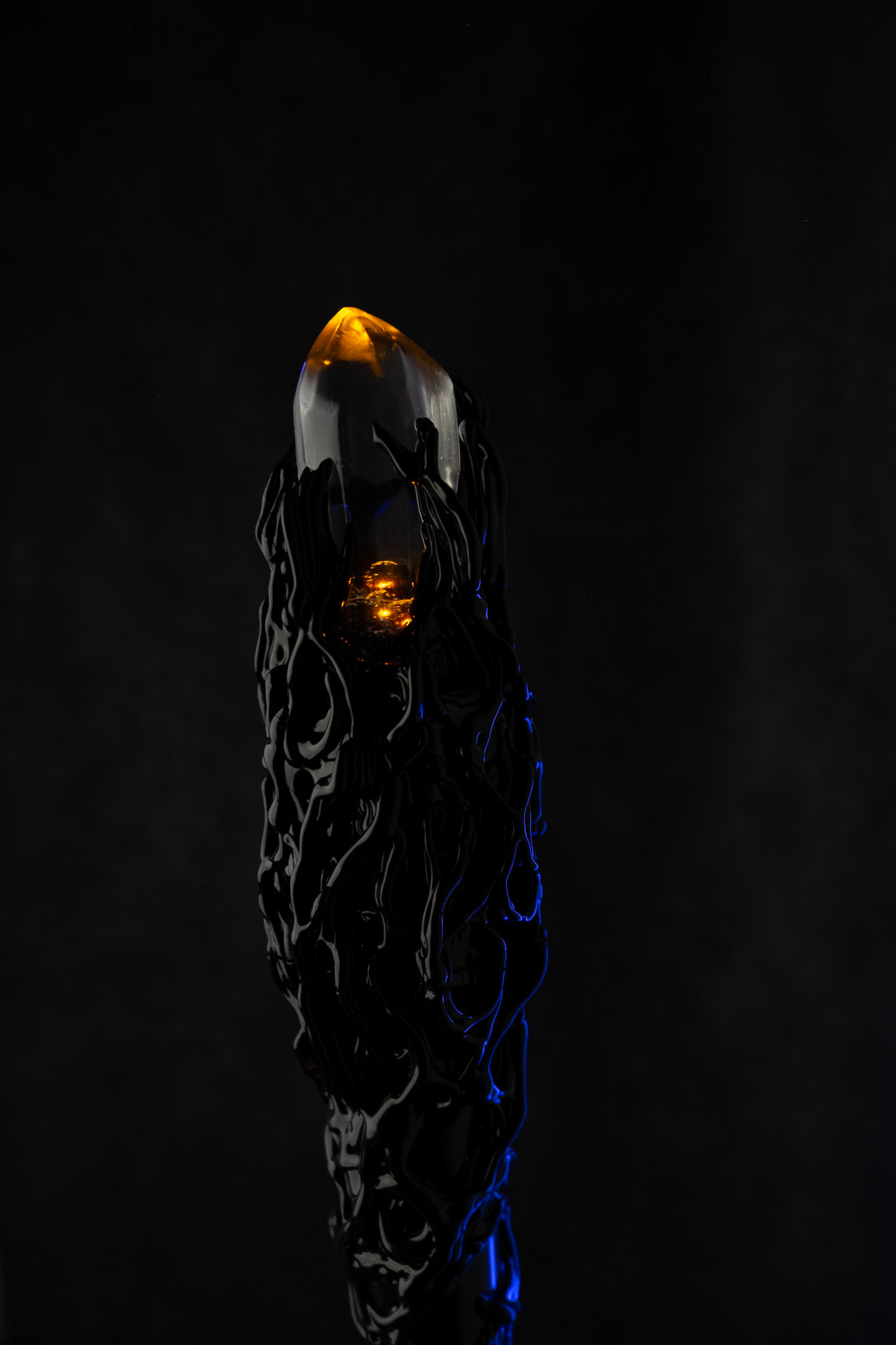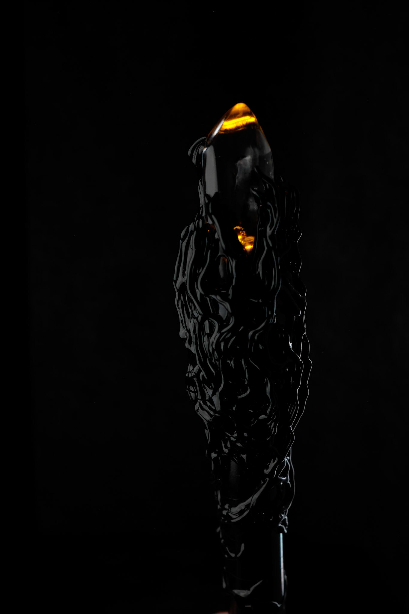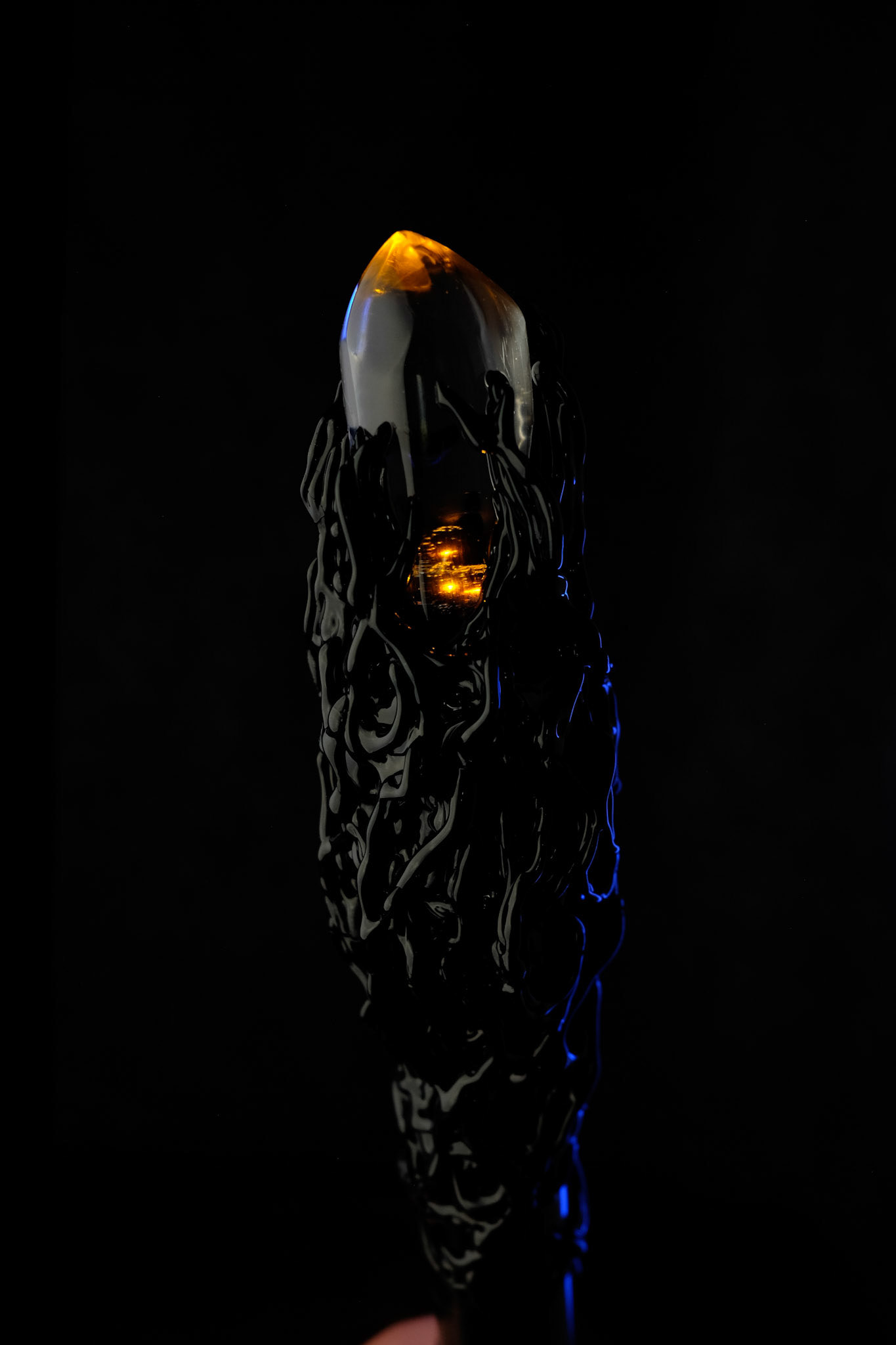 What makes each individual staff unique is the part of these is where the shaft is embellished with black hot glue. All those beautiful swirls and lines are hand crafted using black hot glue. A technique that has taken years to master. The whole staff is finally completed with a shiny lacquer finish. The bottom of the staff is equipped with a rubber stopper to prevent it from sliding on the floor.